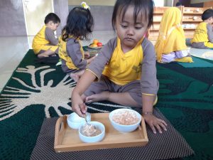 Salah satu dari materi di kelas Montessori. Anak-anak secara inheren tertarik pada aktivitas air. Mereka menyukai proses menuangkan, mencuci, dan memindahkan air. Kegiatan ini membangun konsentrasi seorang anak yang kuat bertahan lama. Yang bisa dihasilkan dari pembelajaran ini adalah antara lain, :