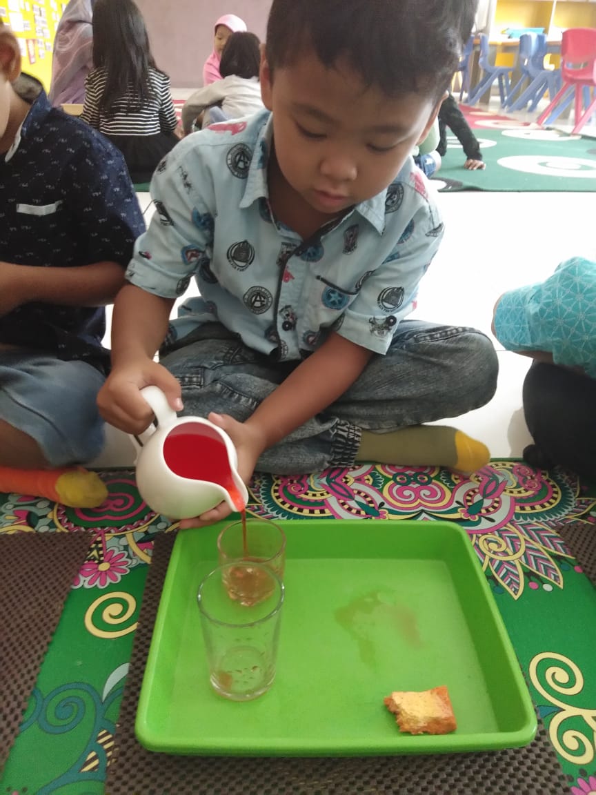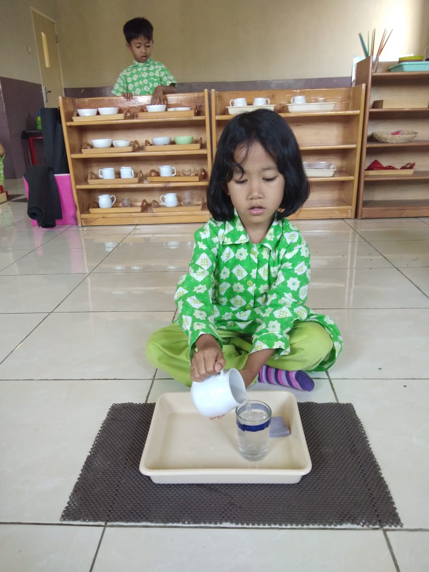 Salah satu dari materi di kelas Montessori. Anak-anak secara inheren tertarik pada aktivitas air. Mereka menyukai proses menuangkan, mencuci, dan memindahkan air. Kegiatan ini membangun konsentrasi seorang anak yang kuat bertahan lama. Yang bisa dihasilkan dari pembelajaran ini adalah antara lain, :